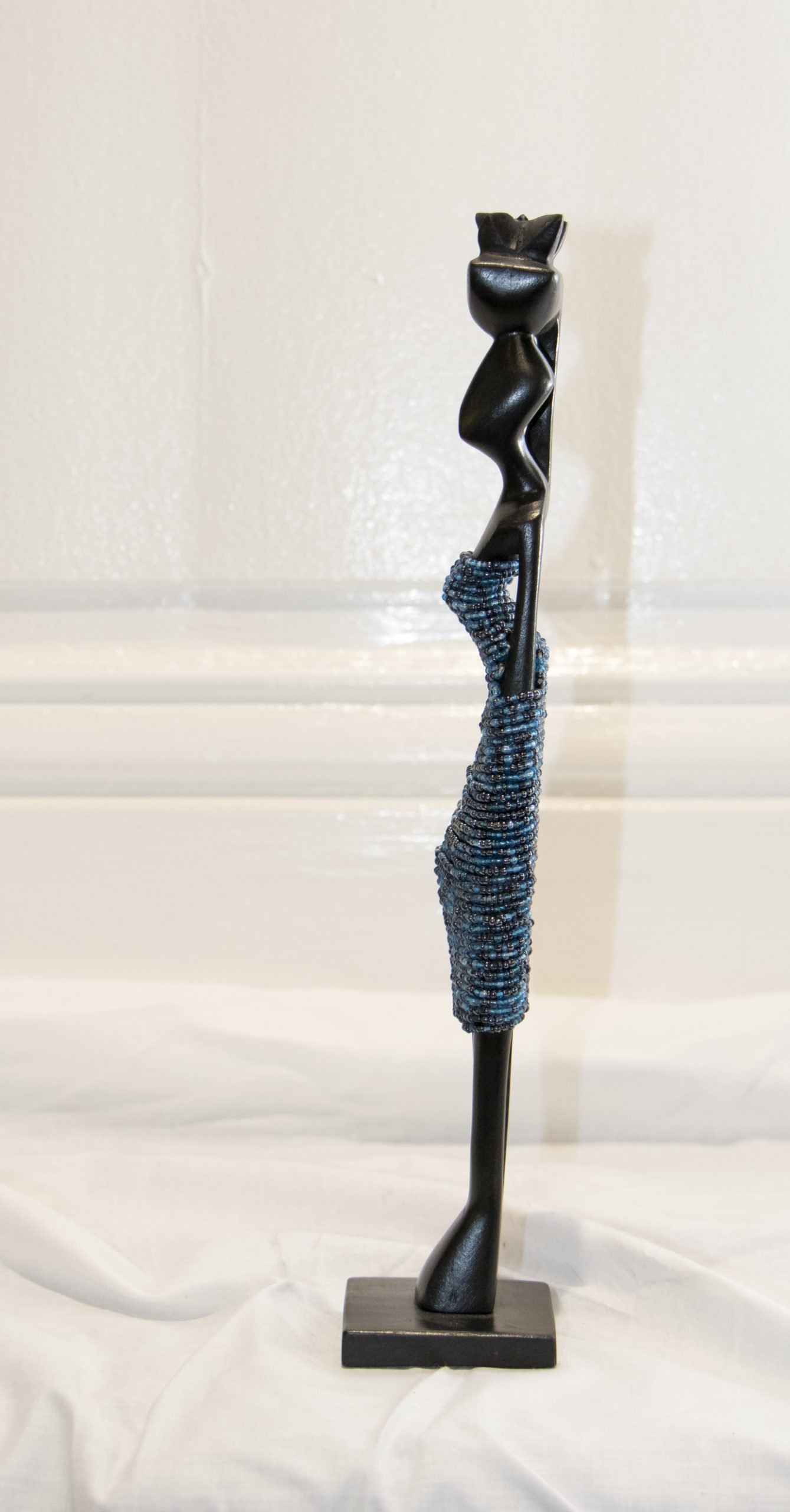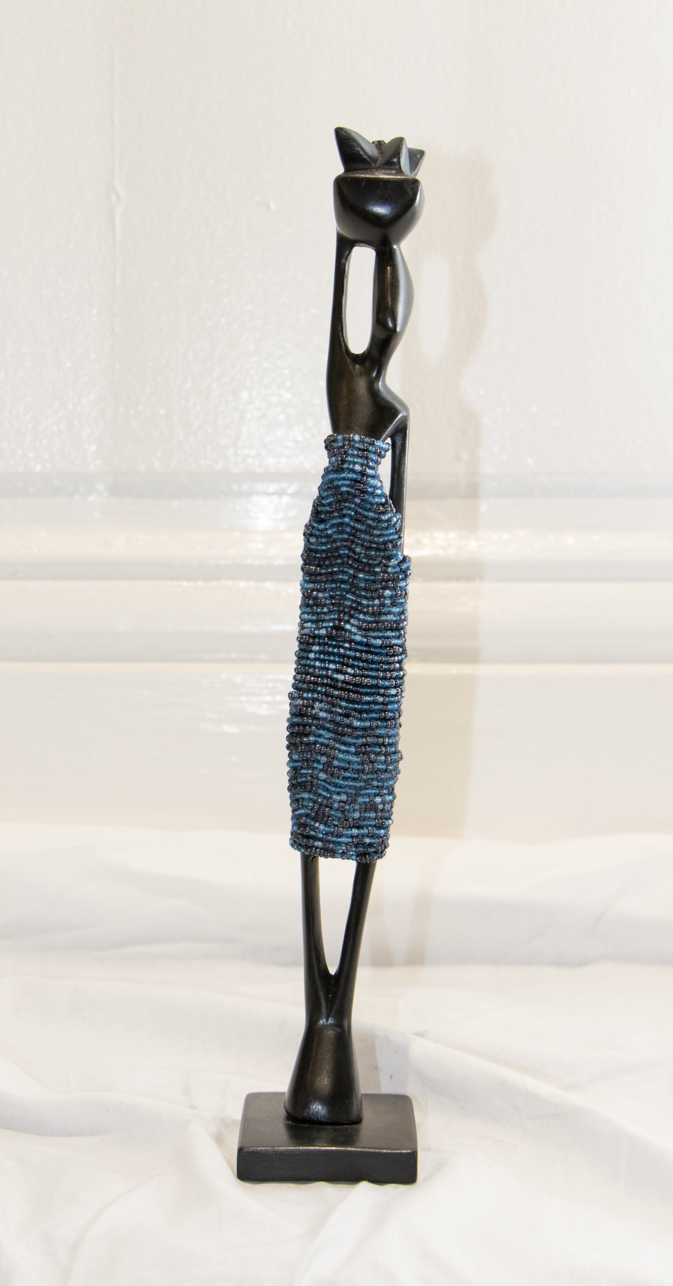 Une sculpture élégante en ébène, capturant la grâce de la femme africaine porteuse, parée d’une robe de perles éclatantes.