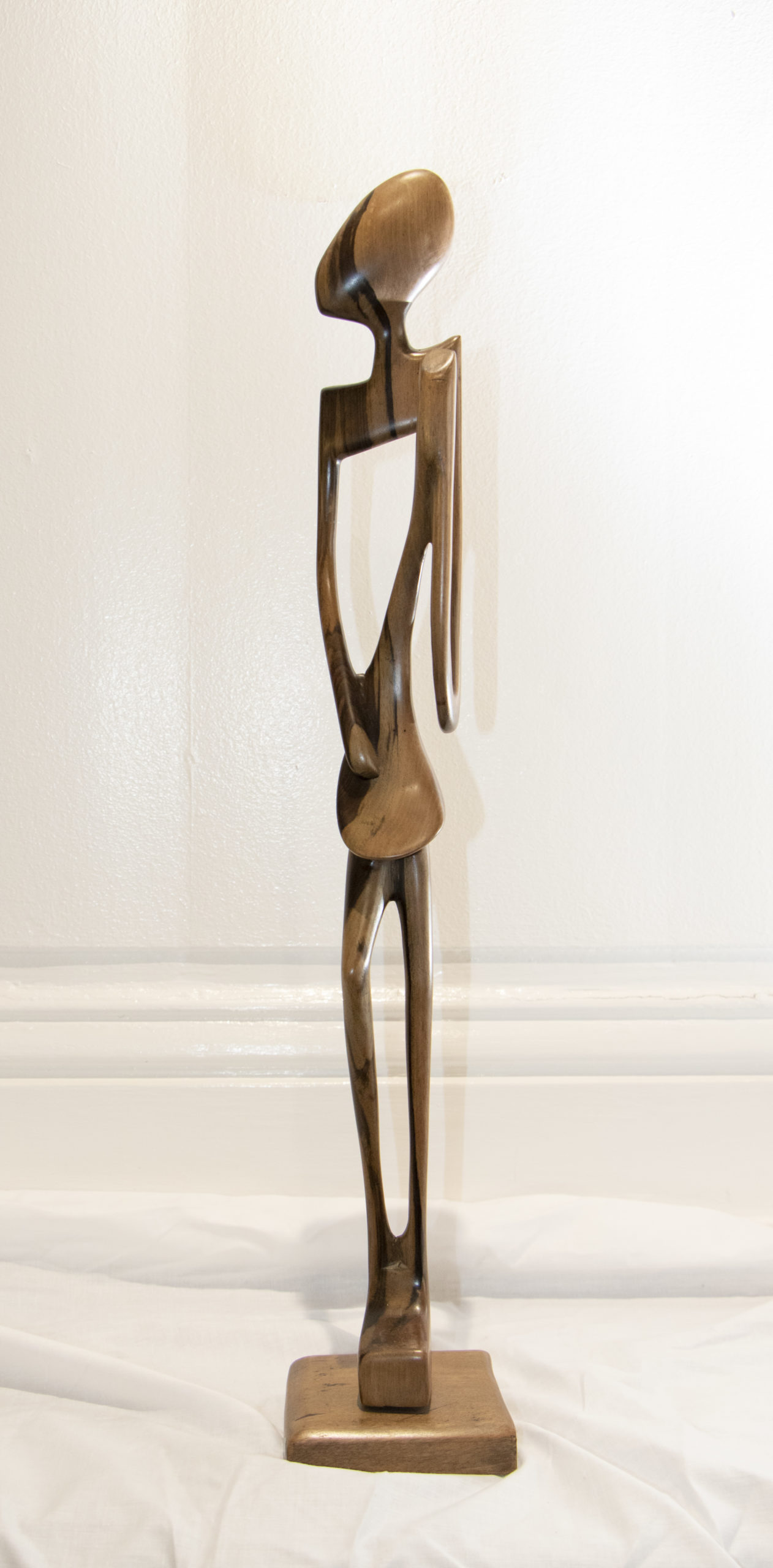 Le « Joueur de Cithare » capture la symbiose entre l’art du bois et de la musique dans une Sculpture taillée dans un morceau de bois d’Ebène brut et nervuré. Cette œuvre incarne la maîtrise dans la manipulation de cette matière précieuse et exigeante.