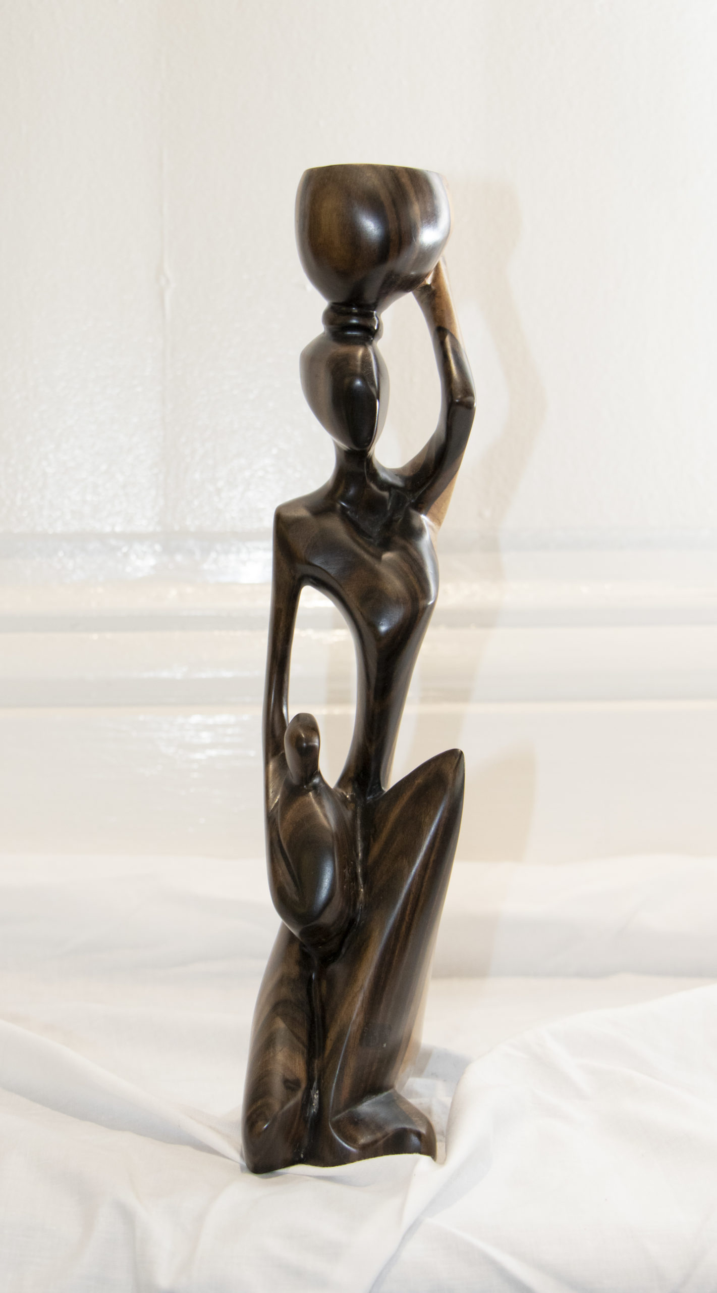 Statue unique en ébène illustrant une femme portant à la fois son fils dans les bras et un pot sur le tête.